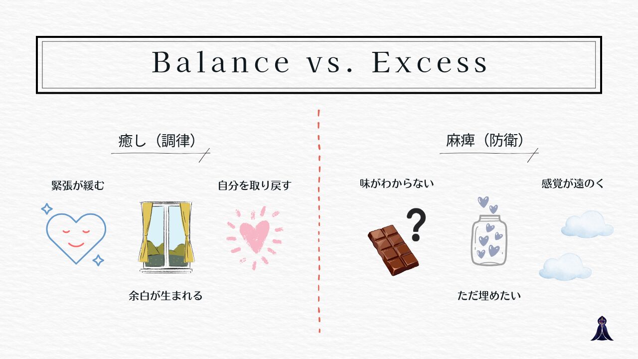 • 癒やしとして機能している場合: 一口の甘みが呼び水となり、内側の緊張が緩み、自分を取り戻すための「余白」が生まれます。