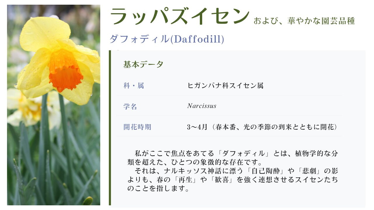 今回はスイセン[Narcissus]の中でも、暖かくなる頃に咲く、ラッパスイセンをはじめ華やかなスイセンたちについて、私の感じるところやこの植物に纏わるエピソードから考察していきます。
