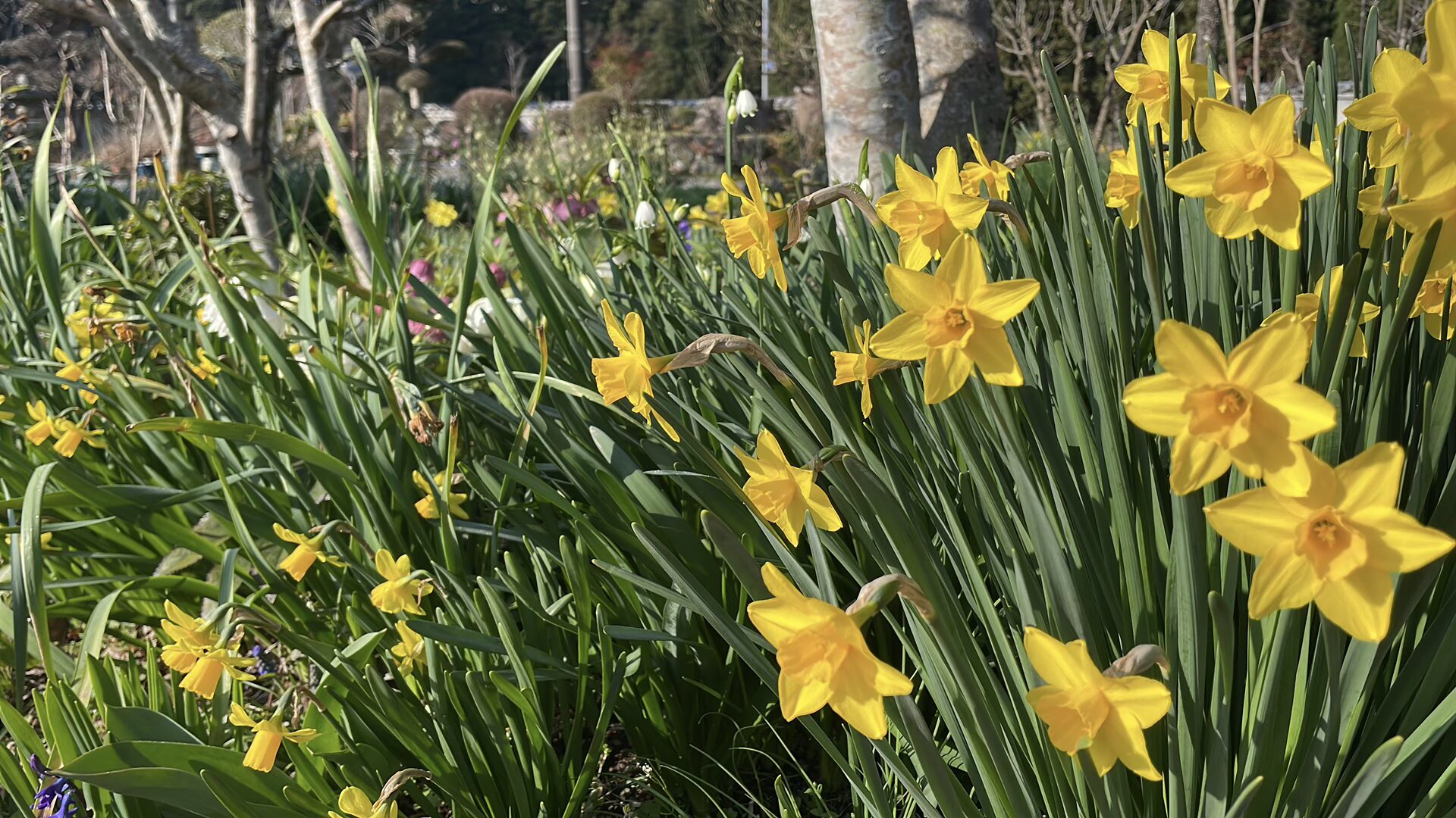 年末、まずはニホンスイセンが寒さの中から顔を出し、冷たい空気の中で凛としている姿を皮切りに、冬から春へのグラデーションの中で、様々な品種がリレーをしていく。