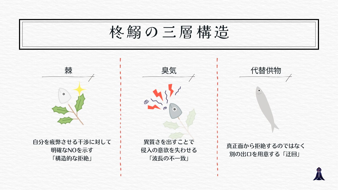 「刺」は、自分を疲弊させる干渉に対して明確なNOを示す「構造的な拒絶」です。「臭気」は、あえて相手の期待に応えない異質さを出すことで侵入の意欲を失わせる「波長の不一致」。そして「代替供物」は、真正面から拒絶するのではなく別の出口を用意することで干渉を無害化する「迂回の技術」です。