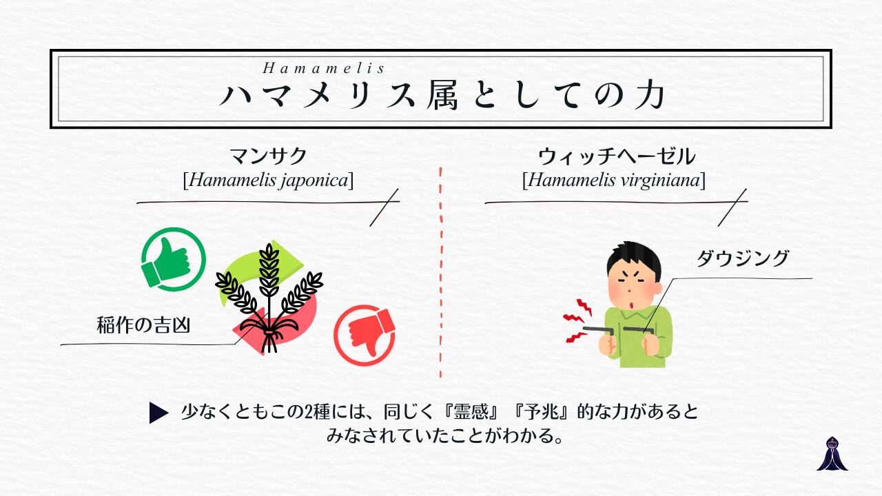 ウィッチヘーゼルは日本のマンサクとは同属別種の話ですが、少なくともこの2種、日本のマンサクとウィッチヘーゼルには、同じく「霊感」「予兆」的な力があるとみなされていた記録が残っています。ハマメリス属全体に共通する性質かどうかは、今後の調査に委ねる余地がありますが、属としての方向性は一致しているといえそうです。