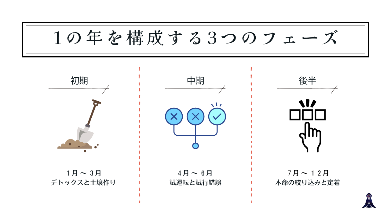 12ヶ月を詳しく見る前に、この1年を貫く3つの大きなフェーズを押さえておきましょう。